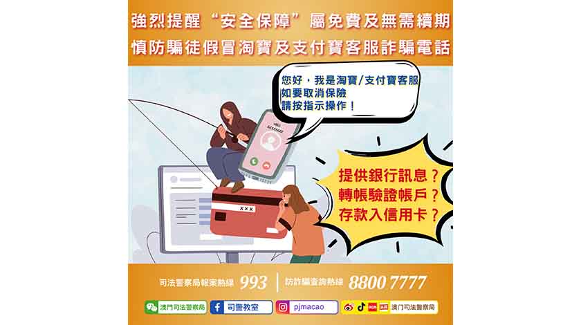 根據案情顯示,騙徒會以“+853”開首的流動電話號碼致電事主並使用普通話自稱“淘寶”、“支付寶”客服人員,訛稱事主的“資金安全保障”、“支付安全保障”到期,要求事主配合其指示進行操作以取消該保險服務,否則將會收取高額費用,包括提供銀行賬戶及信用卡資料、下載APP進行手機同屏、轉賬至指定戶口進行驗證等。