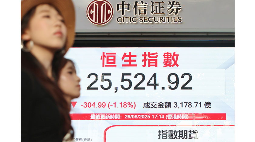 【香港中通社8月26日電】(記者 張明臻)大市經過25日一輪急升後,26日略見回調。恒指26日收報25524點,跌304點或1.18%;大市全日成交3178億港元。