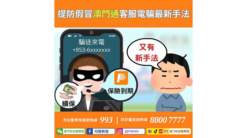 據了解,騙徒會以澳門流動電話號碼致電事主,並以普通話冒充“澳門通”客服人員,聲稱事主早前透過MPay開通的保險服務已到期,若未能依指示取消將被收取高額費用。及後,騙徒進一步要求事主提供銀行及信用卡資料,甚至下載應用程式進行手機同屏操作,或將資金轉賬至指定賬戶以作所謂驗證,企圖以各種手法誘使事主上當受騙。