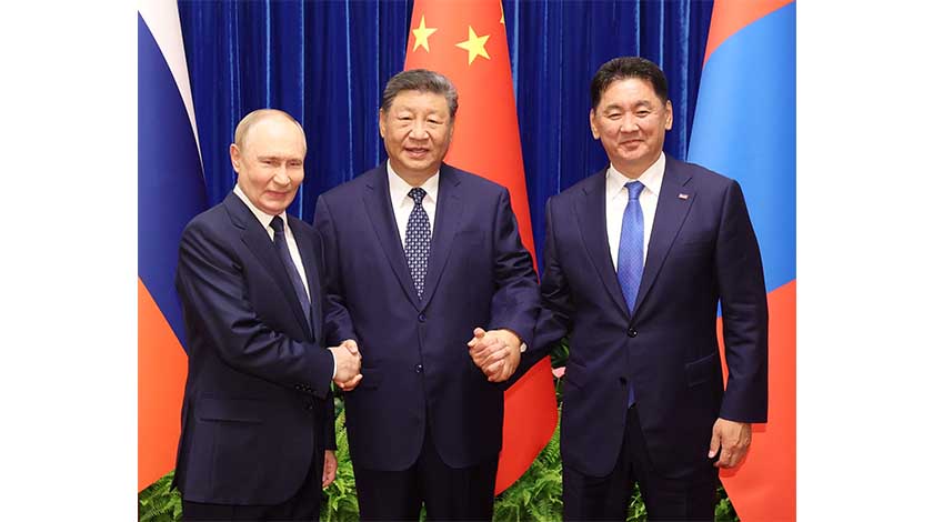 【中新社北京9月2日電】9月2日上午,中國國家主席習近平同俄羅斯總統普京、蒙古國總統呼日勒蘇赫在北京人民大會堂舉行中俄蒙三國元首第七次會晤。