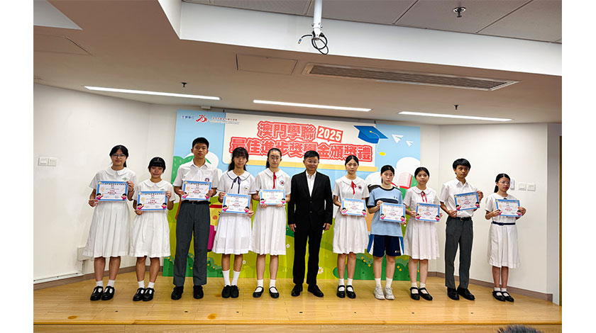 【本報訊】澳門中華學生聯合總會昨假辦事處舉行「二零二五年澳門學聯最佳進步獎學金」頒獎禮,共有六十五名來自大專、中學及小學的學生獲獎,學聯期望透過獎學金勉勵學生保持學習熱誠,積極裝備自我,為澳門社會及國家建設貢獻力量。