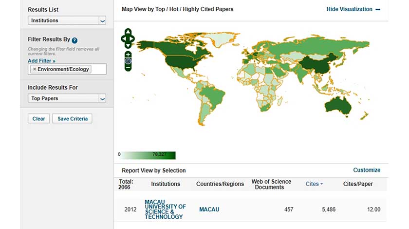 ESI 是基於Web of Science核心合集中近十年全球12000多種學術期刊的論文和引文數據進行的權威統計分析,用於評估大學、研究機構及國家/地區的國際學術水平及影響力。只有近十年發表的論文的總被引頻次排名位於全球前1%的學科才能進入榜單,目前已成為世界範圍內公認的評價學科發展水平的重要參考工具之一。本次環境/生態學學科的突破,充分體現了澳科大在該領域的科研貢獻、學術產出和國際影響力獲得了廣泛認可。