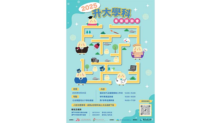 【特訊】澳門中華學生聯合總會及澳門中華新青年協會將於9月20日下午3時至6時假化地瑪聖母女子學校舉行“升大學科專業諮詢會2025”,讓學生提前了解不同專業,為未來升學作好準備。