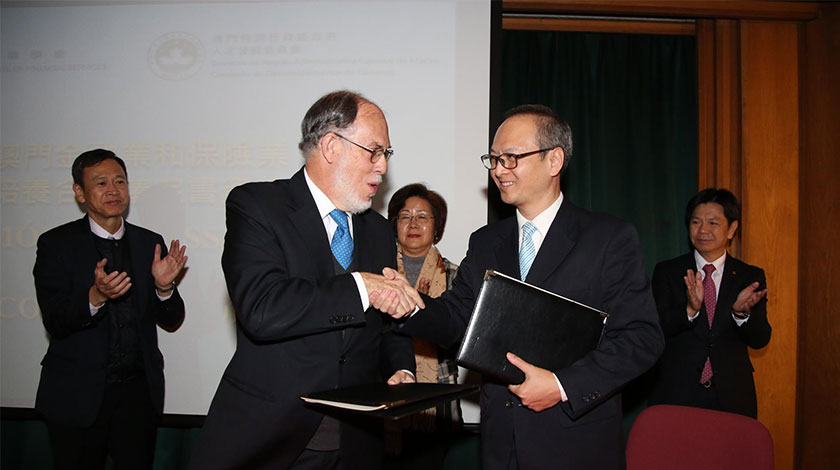 【特訊】人才發展委員會14日於澳門金融管理局3樓禮堂舉行協議簽署儀式,分別由澳門金融學會管理委員會主席潘志輝及人才委秘書長蘇朝暉代表雙方簽署,並協定由明年起合作開展有關金融及保險業的人才培養計劃。