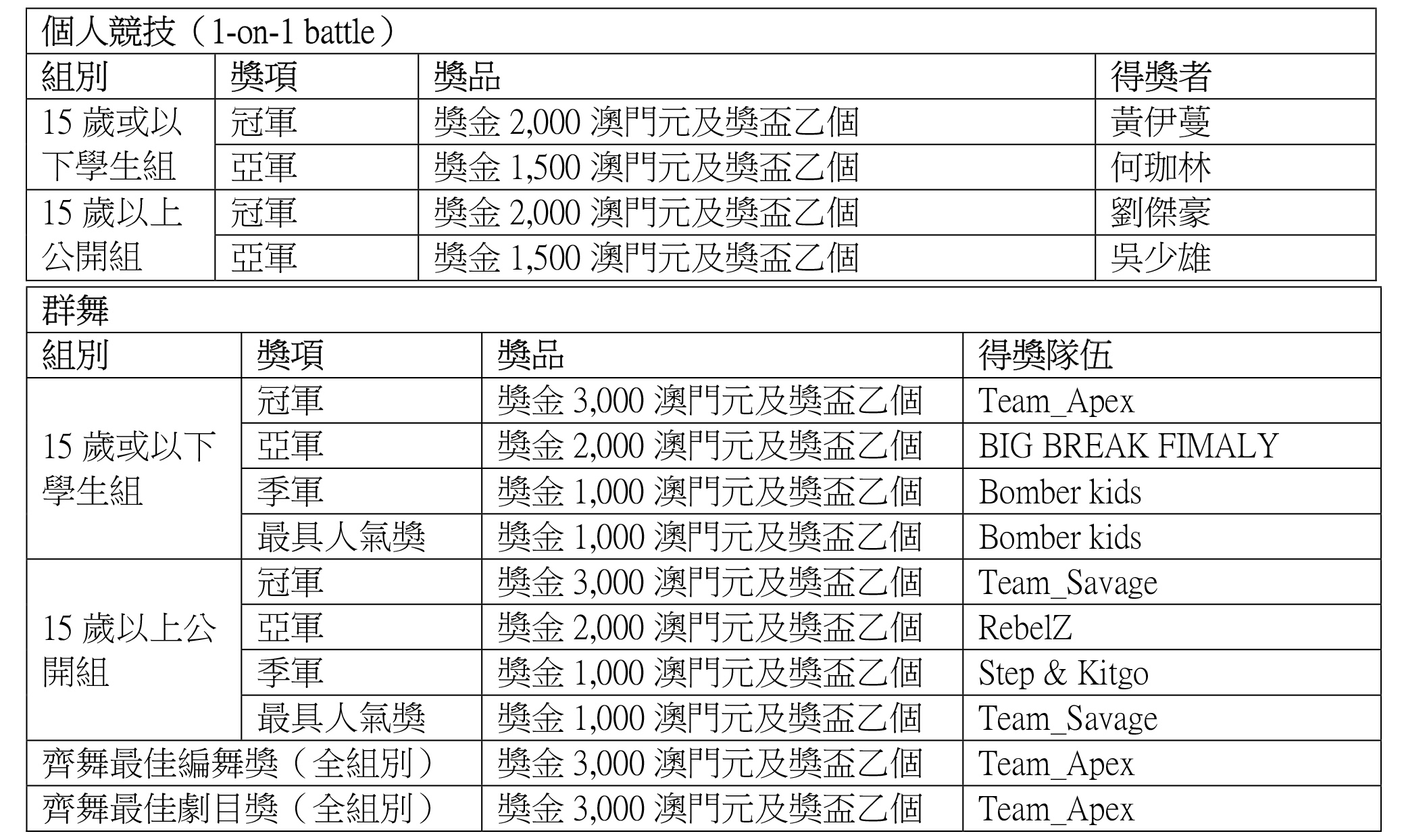 各場比賽競爭十分激烈,評審團對參加者的評分嚴謹而公正。比賽結束後,評審們還向參賽者提供了寶貴的建議,讓參加者獲益良多。今年齊舞組還增設「最具人氣獎」,早前在澳電Facebook專頁上由公眾投選最喜歡的隊伍,獲最多Like的隊伍獲得此獎項。第三屆澳電「源源帶動活力」街舞大賽得獎名單如下: