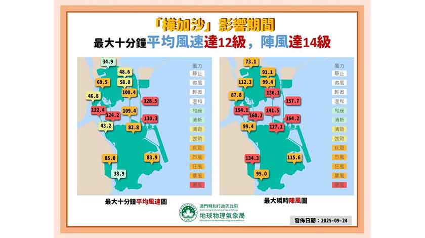 回顧十號風球生效期間,本澳各區錄得最大10分鐘平均風速達12級,最高陣風更達14級。此外,熱帶氣旋信號生效期間,整體達八號風球風力或以上時段長達15小時。(圖2)