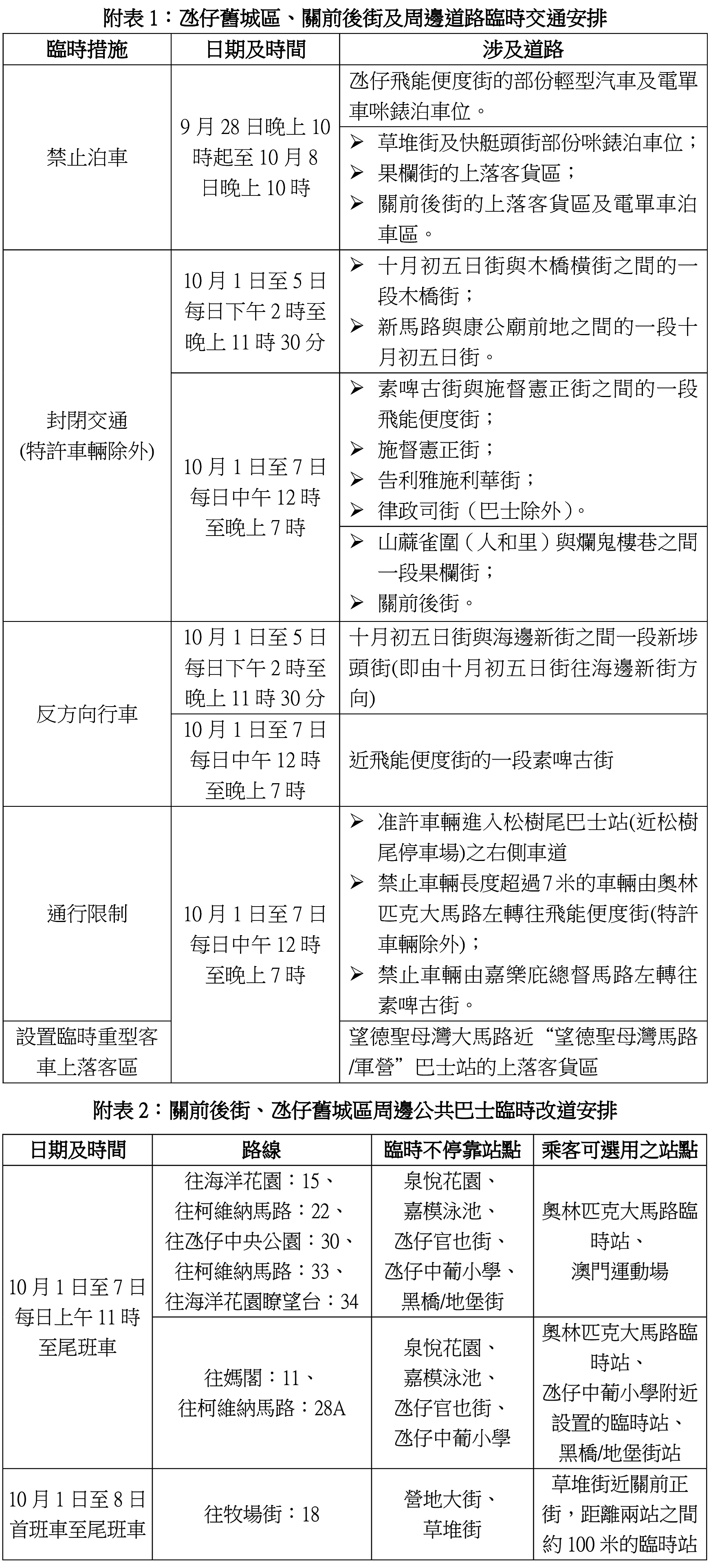 兩個臨時行人專用區於10月1日至7日每日中午12時至晚上7時實施,當中,氹仔舊城區實施之臨時措施與過去相約,包括專用區範圍及周邊部份道路臨時封閉交通、素啤古街部份路段反方向行車、區內咪錶泊車位9月28日至10月8日禁止車輛停泊等(詳情可參閱附表1)。巴士方面,一如既往於行人專用區實施期間的每日上午11時至尾班車期間實施巴士改道措施,市民及旅客可於巴波沙總督前地、鄰近氹仔中葡小學設置的臨時站乘搭11及28A路線,或前往奧林匹克大馬路或望德聖母灣大馬路(近輕軌排角站)的巴士站點,乘搭多條巴士路線來往各區,其中包括於假期增開的26AT巴士路線。詳情可參見附表2及留意兩巴網站(www.tcm.com.mo及www.transmac.com.mo)