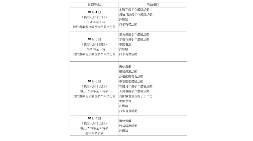市政署管委會昨介紹“月滿團圓”中秋晚會系列活動。盧廉若公園的中秋晚會首次擴展至澳門茶文化館,內容包括攤位遊戲、競猜燈謎、中華服裝體驗、中樂表演等,當晚亦舉行應節手作體驗活動,皮影戲表演及親子工作坊等,當中部分活動將提前於十月四日及五日下午三時至六時舉行,與市民一同迎月。而於氹仔中央公園的中秋晚會則設有攤位遊戲及競猜燈謎等。為配合中秋晚會的舉行,氹仔中央公園足球場將在十月六日停止對外開放。