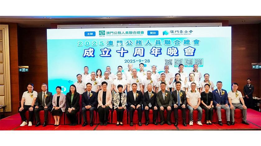 【特訊】澳門公務人員聯合總會(簡稱公總)舉辦第四屆理監事就職典禮暨十周年會慶,中聯辦副秘書長兼社工部部長黃華蓋,澳區全國人大代表、工聯總會會長何雪卿,澳區全國人大代表蕭志偉、吳小麗,行政會余成斌委員,衛生局羅奕龍局長,勞工事務局陳子慧副局長,郵電局行政委員會鍾煥玲委員,行政公職局代表陳思恆代廳長,立法會李靜儀、李振宇議員,工聯總會梁普宇副會長,以及十多個公務人員團體代表出席。席間由彭冠豪會長帶領一眾理監事進行莊嚴宣誓,並由黃華蓋、何雪卿監誓。