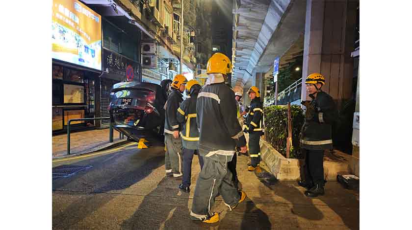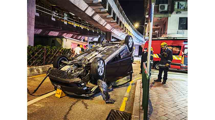 昨晚九時許,消防局接報高士德大馬路與文弟士街交界發生翻車意外,有人受傷。消防員到場見一輛私家車四輪朝天、翻轉路中。一名四十多歲男傷者已自行離開車廂,救䕶員替傷者檢查初步發現他手腳擦傷,替他初步䕶理後將之送往山頂医院治理。