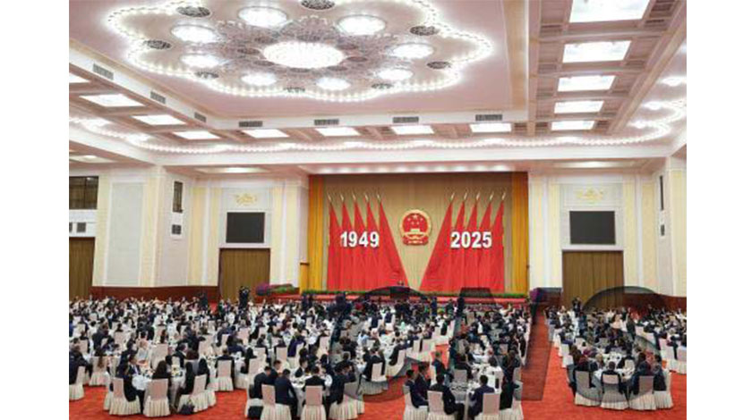 人民大會堂宴會廳華燈璀璨,洋溢著喜慶熱烈的節日氛圍。主席台上方高懸著莊嚴的國徽,“1949-2025”大字年號在鮮艶紅旗映襯下格外醒目。
