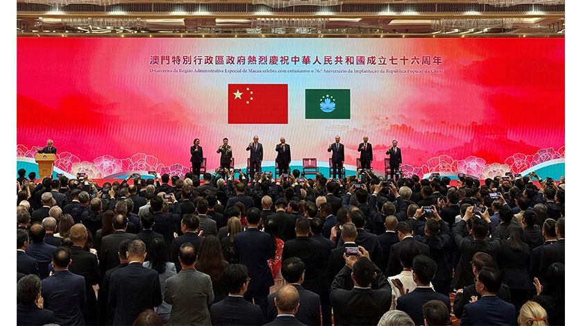 【本報訊】特區政府昨早假中葡綜合體會議廳舉行「慶祝中華人民共和國成立七十六周年酒會」。行政長官岑浩輝於酒會上致辭時表示,將搶抓國家“十五五”規劃帶來的新機遇,全面準確、堅定不移貫徹“一國兩制”方針,堅定維護國家主權、安全、發展利益,堅定落實“愛國者治澳”原則,高質量推進澳門各項建設事業,致力實現法治澳門、活力澳門、文化澳門、幸福澳門的美好願景。澳門並將乘着國家發展的東風,不斷開創“一國兩制”事業高質量發展新局面。