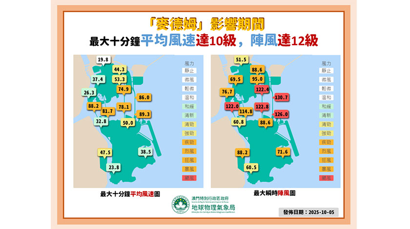 受「麥德姆」影響,自午夜起珠江口地區普遍受烈風或以上風力影響。回顧熱帶氣旋信號生效期間,本澳各區錄得最大10分鐘平均風速達10級,最高陣風達12級。(圖2)