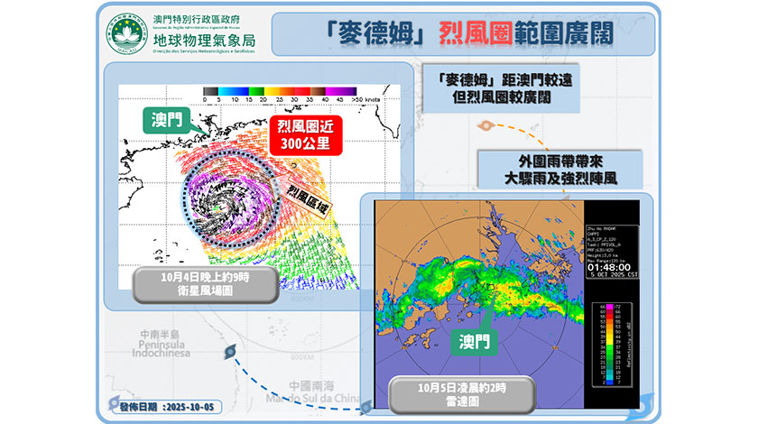 就「麥德姆」而言,雖然其中心與本澳保持約300公里的較遠距離,但由於其烈風範圍廣闊並足以覆蓋本澳,加上疊加雨帶所帶來的強烈陣風 ,八號風球期間本澳空曠地區及大橋風力持續達8級或以上。因此,並不能單以距離遠近作為是否需要掛風球的考量。