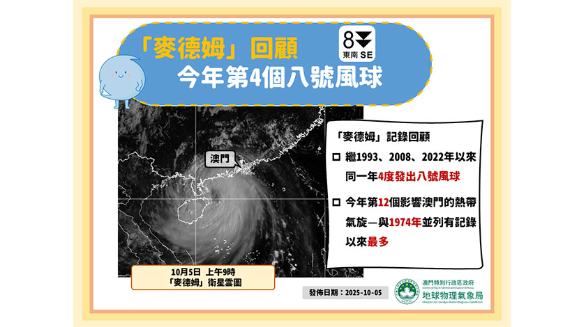 「麥德姆」為本年第12個影響本澳的熱帶氣旋,與1974年並列為有記錄以來發出最多熱帶氣旋信號的年份;同時亦是繼1993、2008、2022年以來,再度於同一年內需要4度發出八號風球。 (圖1)