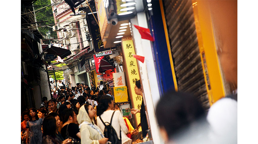 昨早十一時前,即距離改發三號風球仍有兩個多小時,已有很多遊客抵達大三巴,人數看來與平日相若,周邊的手信店亦已營業,現場完全沒有「打風的感覺」。