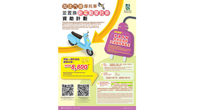 《淘汰汽油摩托車並置換新電動摩托車資助計劃》是配合國家實現“雙碳”目標的重要舉措,亦是特區政府本年度施政方針和“澳門電動車推廣計劃”的重點工作,申請期由2025年10月15日至2030年10月14日,為期五年。資助對象範圍擴大至所有在澳門特別行政區具備有效註冊的重型或輕型汽油電單車車主,但不包括在2025年10月6日或之後已被取消註冊且其後重新註冊的電單車車主,以及結欠澳門特別行政區債務的電單車車主。