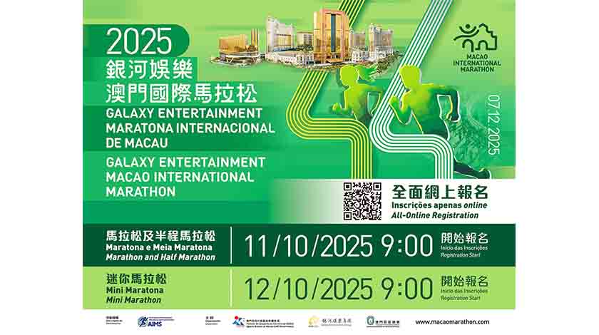 【特訊】由體育局、銀河娛樂集團及澳門田徑總會主辦的「2025銀河娛樂澳門國際馬拉松」將於本年12月7日(周日)舉行。馬拉松及半程馬拉松項目將於10月11日(周六)上午9時開始接受報名,而迷你馬拉松的報名將於10月12日(周日)上午9時開始。各項目報名名額為:馬拉松1800名,半程馬拉松4800名,迷你馬拉松5400名。名額有限,報滿即止。