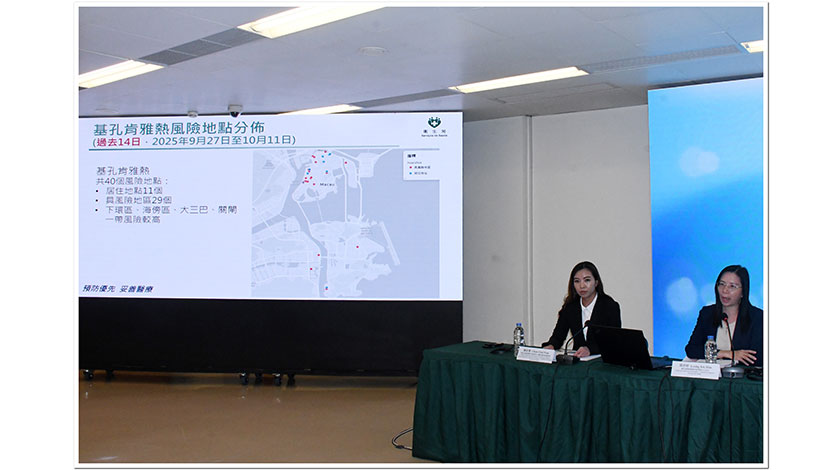衛生局局長羅奕龍表示,自七月底本澳出現首宗輸入性基孔肯亞熱病例以來,截至十月十一日,本澳錄得卅二宗基孔肯雅熱病例,其中廿四宗為輸入病例,八宗為本地感染,結合鄰近地區的疫情情況和人員流動,澳門基孔肯亞熱輸入風險持續。加上近日澳門天氣仍然炎熱和多雨,適合白紋伊蚊孳生,前天更出現了兩個本地病例,本澳疫情風險進一步上升。