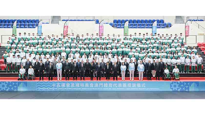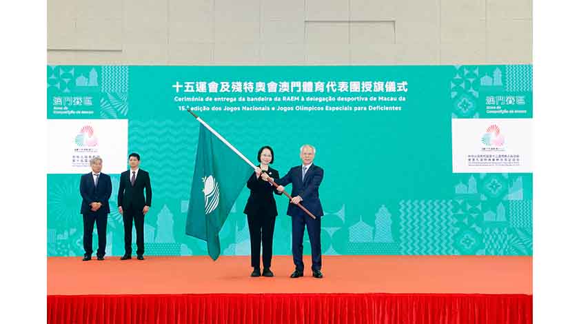 儀式在莊嚴的國歌聲和會歌《氣勢如虹》激昂旋律中拉開序幕。行政長官岑浩輝向十五運會及殘特奧會澳門體育代表團代表、社會文化司司長柯嵐授予特區區旗及勉勵體育代表團取得佳績。本澳將分別派出超過400人的體育代表團參加十五運會的23個比賽項目,包括:水上運動(游泳、藝術游泳、跳水)、田徑、羽毛球、籃球(三人籃球、五人籃球)、拳擊、單車、獨木舟(靜水)、劍擊、足球、高爾夫球、手球、柔道、射擊、乒乓球、跆拳道、網球、鐵人三項、排球(室內排球、沙灘排球)、武術、射箭、曲棍球、賽艇、帆船;亦將派出超過180人的體育代表團分別參加全國第十二屆殘疾人運動會的7個比賽項目,包括:田徑、羽毛球、硬地滾球、輪椅劍擊、鐵人三項、游泳、乒乓球;以及參加第九屆特殊奧林匹克運動會的7個比賽項目,包括:田徑、羽毛球、籃球、滾球、足球、游泳、乒乓球。