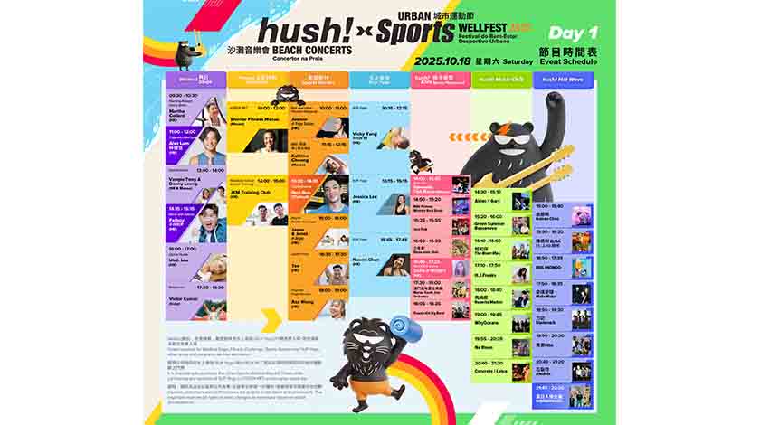 “hush! 沙灘音樂會 x 城市運動節”主活動將於10月18日及19日在黑沙海灘及黑沙臨時休憩空間舉行,設有“Hot Wave”、“Music Chill”、“hush! Kids親子樂園”、“Wellfest舞台”、“動感園林”及“全能挑戰”六大舞台,一連兩日從早到晚帶來馬拉松式的音樂演出和運動課程。現場更設有水上瑜伽、音樂劇親子巡遊、音樂螢光跑、藝術裝置、美食及文創市集、樂器體驗及工作坊等豐富周邊活動,回應市民及旅客的不同喜好和需要,共同感受澳門中西薈萃的文化特色,打造澳門作為中西文明交流互鑒的重要窗口。