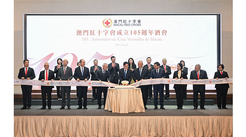 「慶祝澳門紅十字會成立一百零五周年酒會」昨午假旅遊塔宴會廳舉行,由全國人大常委會副委員長、中國紅十字會會長何維,行政長官岑浩輝、全國政協副主席何厚鏵、中聯辦主任鄭新聰,中國紅十字會常務副會長王可、外交部駐澳門特別行政區特派員公署特派員劉顯法、社會文化司司長柯嵐、澳門紅十字會中央委員會主席黃如楷、監察委員會主席崔世昌、理事長覃伯德等主禮嘉賓主持祝酒儀式,另有約三百名社會各界人士出席。