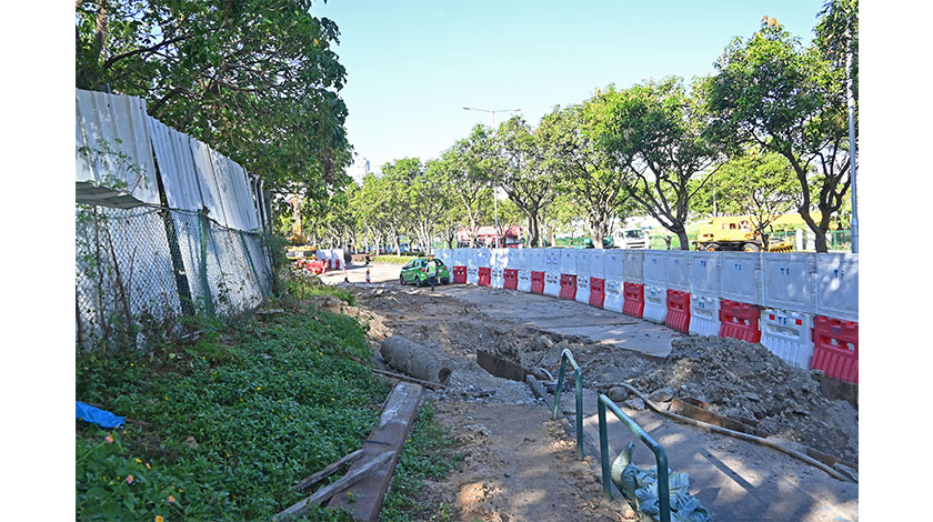 旁邊現正進行路環石排灣廣場下水道整治工程。該段的污水管道已超出設計使用年限,早前亦曾因塌渠而需緊急維修,故會新建一條管徑為一千○五十毫米、長度約為一百五十米的污水管,以滿足排污需求。工程造價一百八十多萬元,工期一百二十天,預計明年一月完工。
