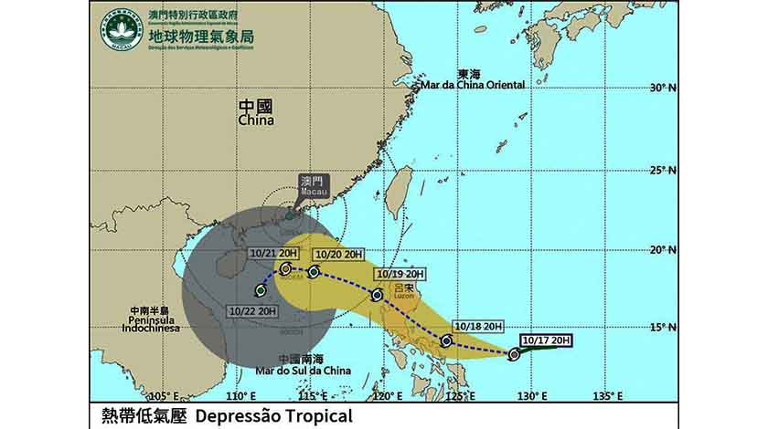 昨晚八時,熱帶低氣壓集結在澳門東南偏東約1890公里處﹝約北緯13.2度,東經128.8度﹞,以時速約30公里向西方向移動,大致趨向菲律賓。