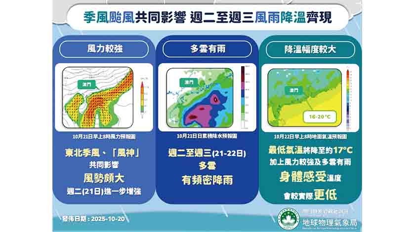 天氣方面,預料今明兩日多雲有頻密降雨,最低氣溫將下降至攝氏十七度左右。由於氣溫下降幅度較大,加上風力較強並伴隨多雲有雨的天氣,身體感受的溫度會較實際氣溫更低,氣象局提醒巿民注意添衣及留意本局最新天氣資訊。