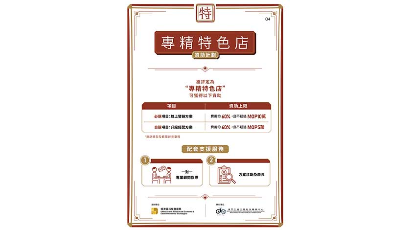是次資助計劃的對象為餐飲或零售業的中小企業,獲評定為“專精特色店”的中小企業,就其線上營銷、打造特色店面以及推出IP聯乘商品等指定費用,可獲六成資助,最高資助上限為15萬澳門元。有意申請的企業須具備“誠信店”資格,並提交自行擬訂的商業計劃書及經營方案。