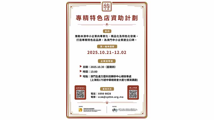 【特訊】為協助本澳中小企業轉型升級,向專業化、精品化及特色化發展,增強整體競爭力,工商業發展基金委託澳門生產力暨科技轉移中心(下稱“生產力中心”)執行的第一輪“專精特色店資助計劃”,將於今日至2025年12月2日接受申請,首輪申請期設有100個名額。為協助企業了解計劃內容,生產力中心將於10月30日舉行企業說明會,歡迎有興趣的企業報名參加。