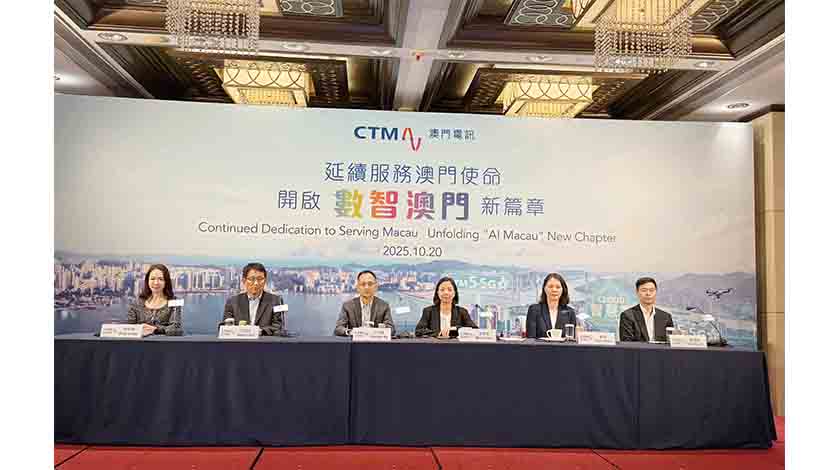 澳門電訊昨午舉行「延續服務澳門使命、開啟數智澳門新願景」新聞發佈會,由澳門電訊商務副總裁湛寶儀、網絡服務副總裁伍時耀、財務副總裁關頴、資訊科技副總裁許國苗、客戶服務副總裁劉健國、企業傳訊總監兼執行委員會秘書陳靜儀,介紹澳門電訊在AI、大數據等應用發展規劃,及一次性全方位通訊服務減免方案等。