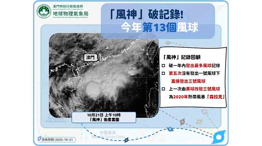 【本報訊】熱帶氣旋「風神」昨遠離本澳,氣象局除下三號風球。今次是氣象局本年度第十三次發出風球訊號,打破自一九六八年有記錄以來,單年發出最多風球訊號的紀錄;第二多為一九七四年,有十二個。此外,今次亦是有記錄以來,第五次沒有發出一號風球的情況下,直接發出三號風球。