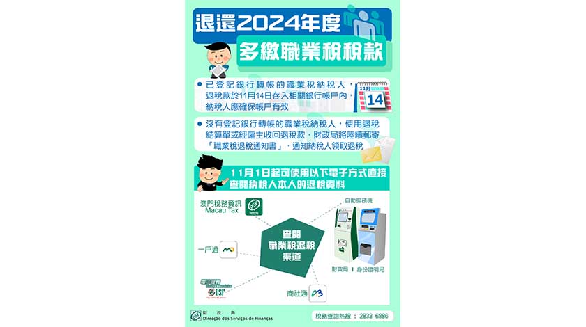 自11月1日起,納稅人可透過財政局移動應用程式“澳門稅務資訊Macau Tax”、“一戶通”、“商社通”、財政局「電子服務」,以及財政局和身份證明局的自助服務機,查閱2024年度多繳職業稅的退稅資訊。