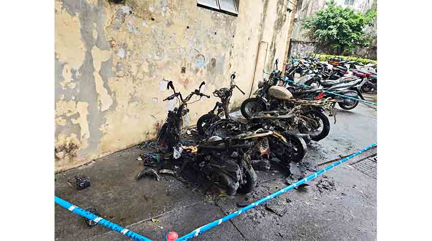 【本報訊】草堆街蠔里昨日清晨發生懷疑縱火燒車事件,四輛泊於路邊的電單車燒至剩下支架、波及旁邊兩部電單車和建築物上冷氣機,消防員到場將火撲熄,無人受傷。司警將案件列作懷疑縱火案處理。