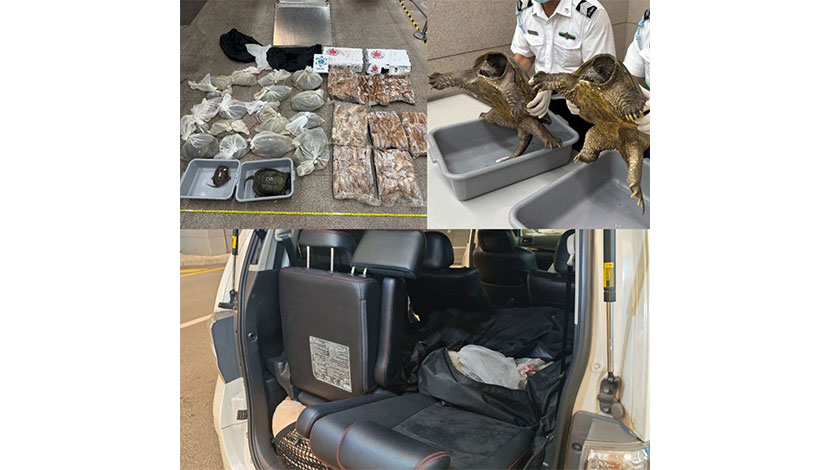 十月廿六日,海關人員透過風險管理系統的預警佈控,在關閘口岸出境車道截查一輛跨境車輛,駕駛者為男性澳門居民。經檢查,發現該男子試將20隻大小不一的活龜、部分體形巨大,另95公斤動物毛皮,收藏車上企圖偷運出境。