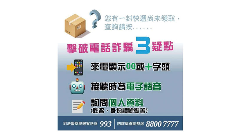 司警列舉騙徒作案手法包括:騙徒冒認快遞公司職員,聲稱事主寄出的包裹有問題,要求核對事主的個人資料;繼而訛稱事主包裹內的物品違法,已被內地公安機關扣押。此外,騙徒又會指要將通話轉駁至內地「司法機關」,然後假扮「官員」訛稱事主涉及嚴重犯罪,要求事主提供個人銀行帳戶資料,並誘使事主將資金轉帳至「安全帳戶」接受審查,以便協助事主洗脫罪名。
