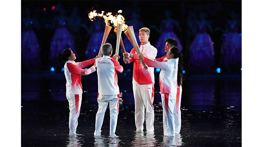 激動人心的場內火炬傳遞和主火炬點燃儀式開始。11月2日,第十五屆全運會火炬在粵港澳三地同步傳遞,最後匯入廣東奧體中心。萬衆矚目下,馬琳、陳若琳、黃金寶、方文浩、郭晶晶、王欣瑜、王柳懿、王芊懿、樑偉鏗、賴宣治、冼東妹、容志行等12位火炬手接力傳遞,最後由蘇炳添、張家朗、李禕共同點燃全運會主火炬。