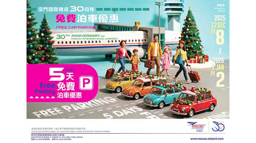 【特訊】為慶祝澳門國際機場營運三十周年,澳門國際機場於冬季旅遊旺季特別推出三十周年免費泊車優惠便利旅客出行。由2025年12月8日起至2026年1月2日,凡在澳門國際機場出遊的旅客可享最多連續5日免費泊車優惠,優惠適用於澳門國際機場南面及北面停車場。