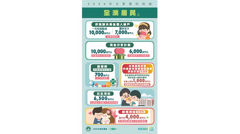 明年主要惠民措施延續包括:現金分享合資格永久居民一萬元、非永久居民七千元;合資格居民非強制央積金個人帳戶額外注入七千元;醫療券七百元;新期持續進修計劃(二六至二九年度)六千元;住宅單位電費補貼每月二百元等。