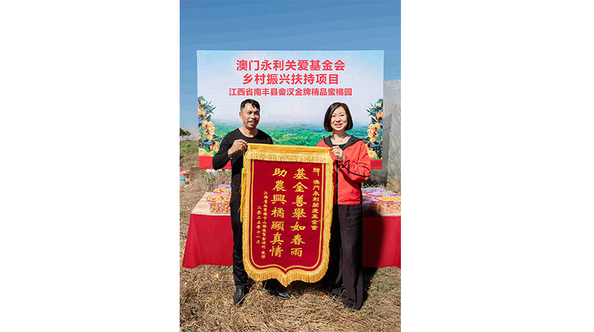 永利自 2023 年開始長期通過多項舉措支持江西鄉村振興,依托自然資源發展特色產業,推動地區實現高質量發展。如先後援建升級了修水縣豆制品加工廠、南豐縣蜜橘種植園、南城縣薯粉制品加工廠等項目,以此響應國家鄉村振興政策。畬漢金牌精品蜜橘園占地 50 餘畝,通過打造精心管理的南豐蜜橘採摘園及精品小康園,促進了地方經濟增效與生態環境保育的雙重實踐。適逢第十七屆江西南豐蜜橘文化旅遊節開幕,南豐縣市山鎮進賢畲族村黨支部書記、村委會主任劉春根陳志玲主席致送錦旗,感謝永利關愛基金會對南豐蜜橘的大力支持,助力宣傳南豐蜜橘,讓甜蜜走向澳門、走向世界。