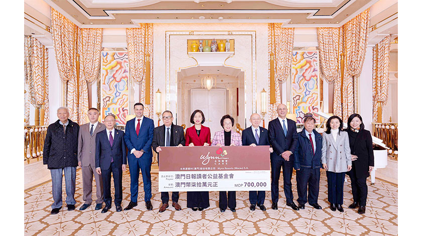捐贈儀式昨(19)日於永利皇宮舉行。永利澳門有限公司總裁、董事會副主席兼執行董事陳志玲、營運總裁兼執行董事羅偉信、財務及行政事務總裁郭富隆、永利澳門及永利皇宮社區及政府關係副總裁張詩敏,代表永利將善款支票交予澳門日報讀者公益基金會,並由該基金會會長賀定一、副會長陸波、飛安達、許建章、理事長黃國勝、常務副理事長何凱玲、鄺鍵濠及監事長吳柱邦代表接受。