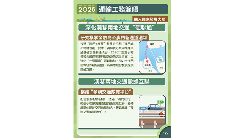 運輸工務司的《施政方針》跟進長官的施政報告提出研究橫琴金融島至澳門新通道選址。譚偉文在立會回應議員施家倫的提問時表示,與深合區建設局充分溝通,考慮不同需求制定短中長期規劃。短中期規劃是新通道連接氹仔,可以較快完成;長期規劃是連接媽閣,涉及大型工程。