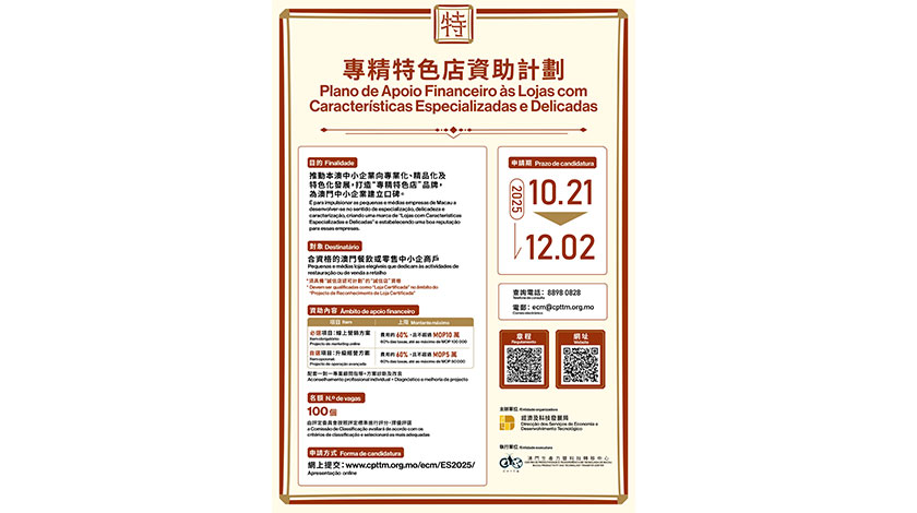 【特訊】為推動本澳中小企業向專業化、精品化及特色化發展,澳門生產力暨科技轉移中心獲工商業發展基金委託,負責執行“專精特色店資助計劃”。該計劃第一輪申請期將於今日截止,生產力中心提醒有意申請或需要補交申請文件的企業盡快辦理相關手續。