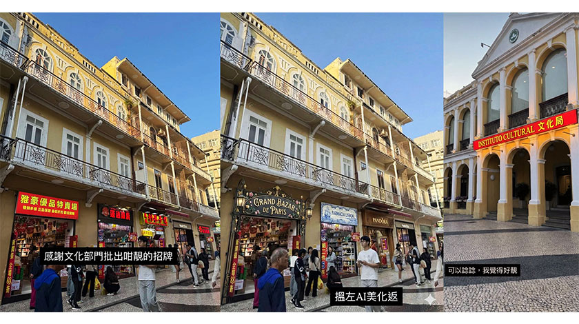 上月,有市民在社交媒體上載那些招牌的圖片,加上一句「感謝文化部門批出咁靚的招牌」;並利用「AI」美化出新的招牌,再將文化局大樓外的白底黑字名牌改為「紅底黃字」,加上一句:「可以諗諗,我覺得好靚」。諷刺意味甚濃!
