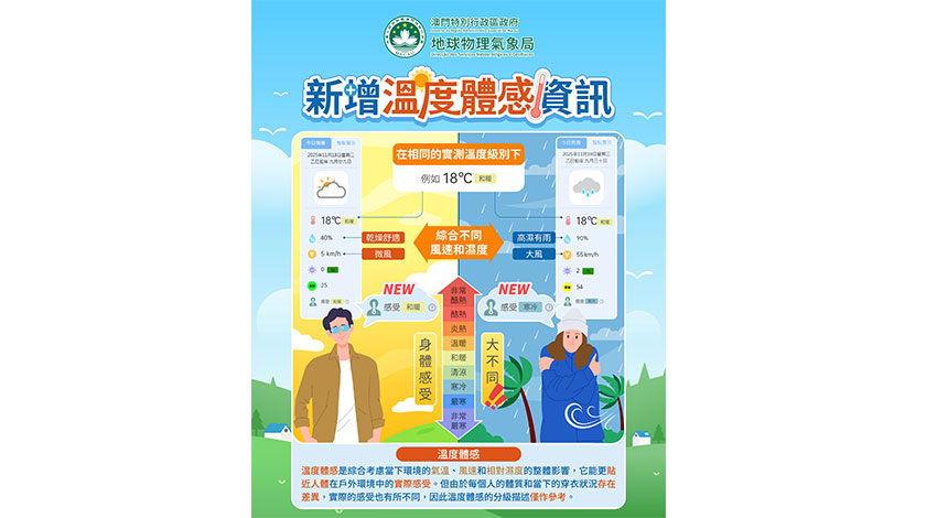 【特訊】為進一步加強與溫度相關的資訊服務,地球物理氣象局自昨日起推出「降溫提示」服務及「溫度體感」資訊。「降溫提示」有助市民及早掌握溫度在短期內的急劇變化,而「溫度體感」則可讓巿民掌握更貼近身體感受的實時氣象資訊。同時,亦優化了冷暖天氣提示的圖標,新圖標將更直觀及清晰。