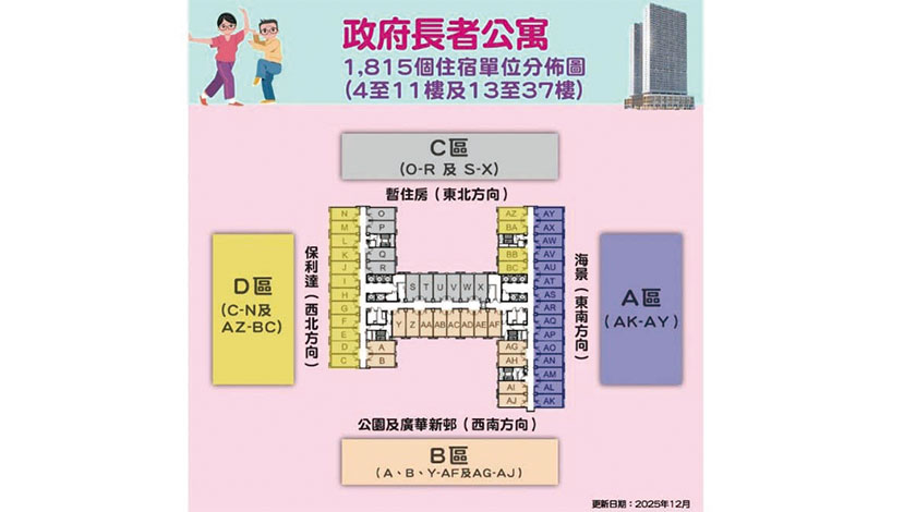公寓正恆常接受申請,反應較預期踴躍。為了讓合資格申請人在選擇單位時有更多選擇,公寓自2026年1月起加推餘下297個單位,包括C區(東北方向)的O至R單位及D區(西北方向)的J至N單位,屆時公寓各區不同座向尚未被選擇的單位全面開放選擇。