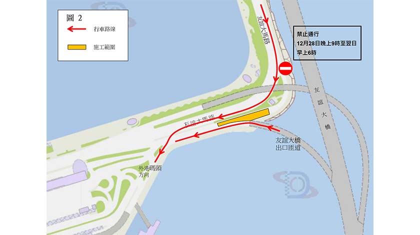 另外,因應A3橋進行匝道樁基礎施工,自2025年12月30日起至2026年2月,近外港碼頭的一段友誼大馬路將使用新建道路,並實施有限度通車。相關臨時交通和巴士安排詳見附表。