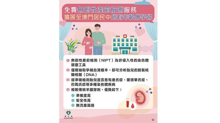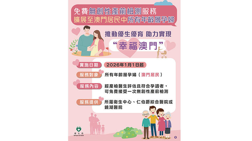 衛生局把無創性產前檢測(NIPT)服務擴展至澳門居民中所有年齡層的孕婦,有助更多家庭尤其高風險孕婦及早獲取關鍵的產前健康資訊,從而作出更適切的醫療與家庭規劃,以減輕家庭經濟與心理負擔,助力實現“幸福澳門”施政願景。倘有疑問,可於辦公時間內致電查詢熱線:83908240。