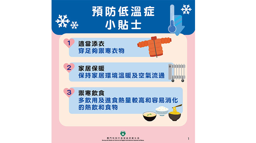 【又訊】氣象局已發出黃色低溫提示,預料本澳未來數日天氣持續寒冷,最低氣溫為12度或以下。衛生局特此呼籲居民預防低溫症,注重禦寒保暖。尤其是長者、慢性病患者,以及負責照護他們的人士和機構,務必採取適當的預防和照護措施,切實保障其健康。